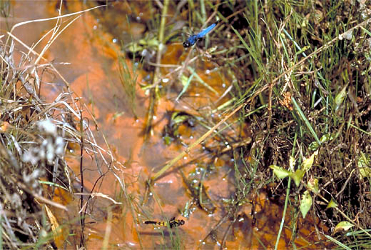 生態:シオカラトンボより少しおくれて,市内では6月に入ってから成虫が出現します.9月ころに羽化して間もないと思われる新鮮な個体がとれたりするので,一年に二化している可能性があります.成熟した成虫は,ため池や小さな小川のほとりの棒の先によく止まっています.幼虫は,湿原の中の流れを好むようですがふつうの池でもみつかります.オスがメスのすぐ上を飛んで警護しながら,メスは単独で打水産卵します.打水といっても,よくみると,水を前方に飛ばしており,この状況からこれを飛水産卵とよぶ人もいます.