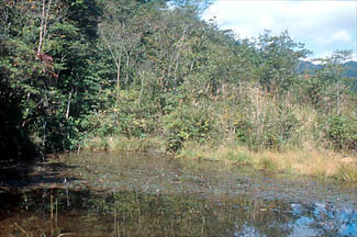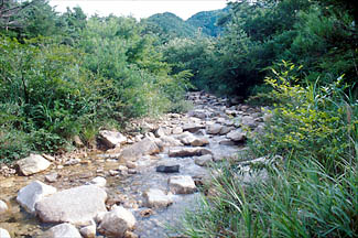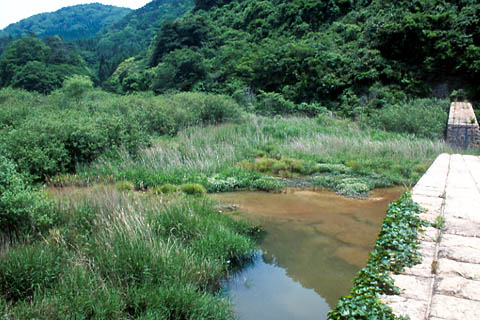 きれいな渓流と、それをせき止めてできた水たまりや湿地などに生き物が集まっています。 |
