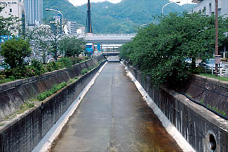 新生田川:都心部を流れる河川は、治水のため、一直線で、深く、コンクリートで固めて、水が一気に海に流れるように設計しています。