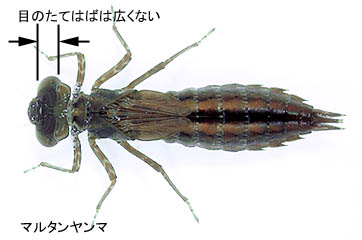 目の形がギンヤンマなどとちがっています。下あごをのばし、双眼実体顕微鏡で見ると細い毛が生えています。 |
