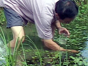 | 場所は,神戸市立糀台小学校の池のビオトープです.2003年8月15日に,生物群ごとにいくつかの班に分け,2時間ほどの採集活動を行って,理科室で写真撮影,同定を行い,後日結果をWebページ形式でまとめました.採集は専門的になりすぎないように,子どもたちができる程度の方法で行っています. |